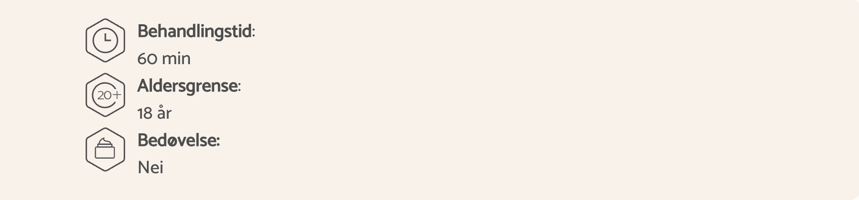 Behandlingen skreddersys etter dine behov, og noen av resultatene er synlige umiddelbart. Behandlingen krever ikke konsultasjon i forkant, men dette kan likevel være en god idé om det er første gangen du utfører behandlingen, slik at du sammen med terapeuten din får planlagt det beste behandlingsforløpet for nettopp din hud.